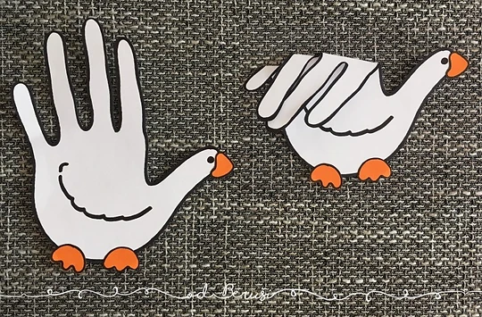 Jednoduché vyrábění pro menší děti. Ty si obkreslí svoji ruku na bílý papír, tu pak vystřihnou a dokreslí/dolepí do podoby husy. Prsty (peří) můžete nechat tak, jak jste je obkreslili, nebo je ohnout směrem dolů.